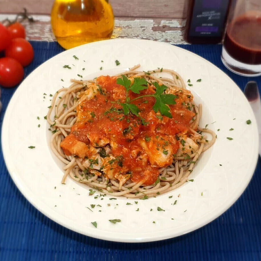 Ingredientes: Sobrecoxa sem pele e sem osso, macarrão integral, molho de tomate natural, tomate, cebola, alho, amido de milho, sal, azeite de oliva, páprica doce e cheiro verde.