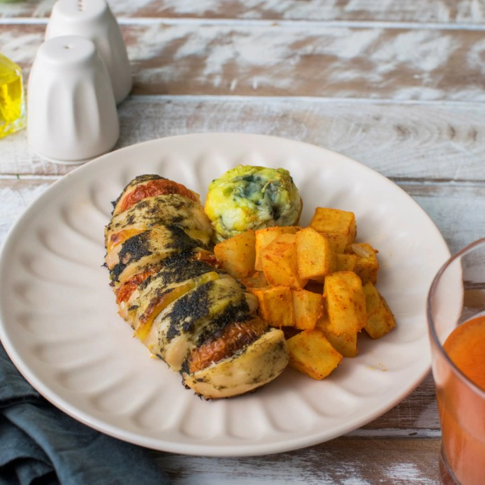 Ingredientes: Peito de frango, batata doce, tomate, queijo branco, molho pesto (azeite de oliva, manjericão, orégano, ervas finas e alho), ovo, abobrinha, espinafre, cheiro verde, sal, alho, azeite de oliva e páprica.
