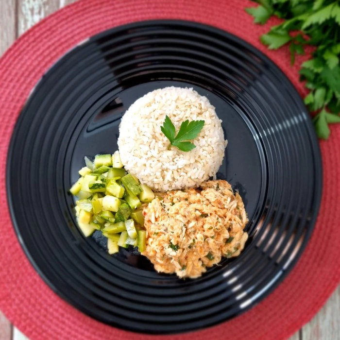 Ingredientes: peito de frango, arroz integral, abobrinha, tomate, cebola, alho-poró, alho, cheiro verde, azeite de oliva, sal.