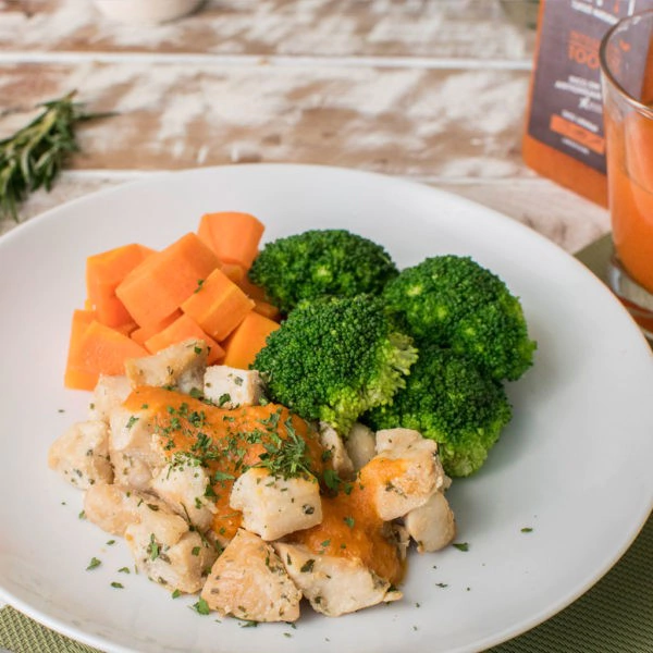 Ingredientes: peito de frango, molho de tomate natural, brócolis, cenoura, alho, sal, azeite de oliva, manjericão e cheiro-verde.