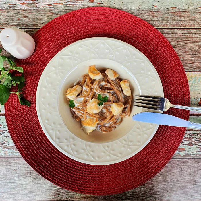 O espaguete integral é combinado com peito de frango em cubos e ervilhas frescas, criando uma refeição nutritiva e leve. O molho branco light, cremoso e equilibrado, traz aquele toque especial sem pesar no sabor. Uma refeição deliciosa, cheia de frescor e perfeita para o dia a dia.