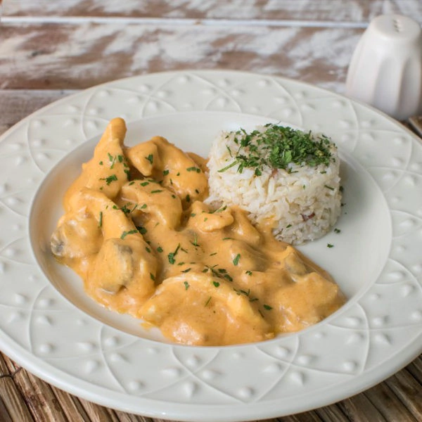 Ingredientes: peito de frango em tiras, molho de tomate natural, arroz integral, leite, creme de leite, champignon, cebola, molho inglês, alho, azeite de oliva, páprica doce, sal e salsinha.