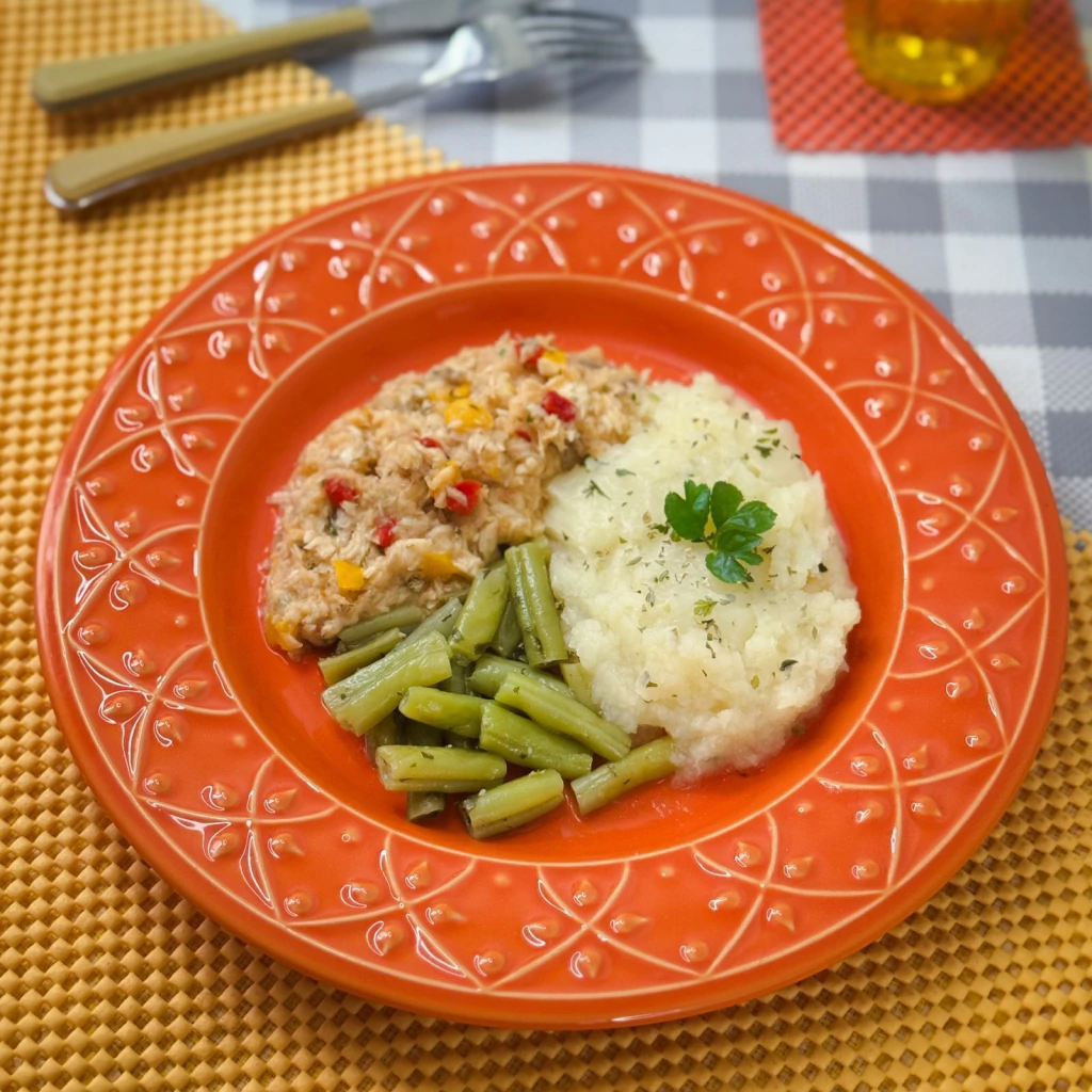 Ingredientes: Tilápia fresca,pimentões, purê de batata inglesa, vagem, alho e sal.